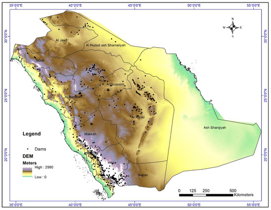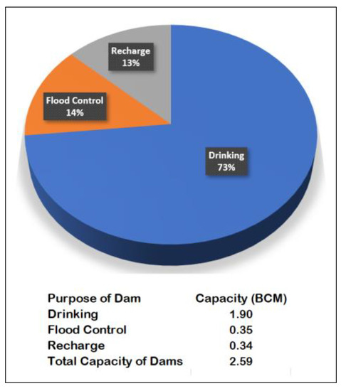 The first dam in the western area of the Kingdom of Saudi Arabia (KSA), the “Ikrimah” dam, was built in 1956; it is 11 m in height, 290 m in length, and has a total storage capacity of 500 MCM. It has been used for underground water recharge. Since then, many other dams have been constructed in the KSA in the last sixty years, reaching 563 dams covering all the regions of the KSA, 117 of which have heights of more than 15 m [38]. The total storage capacity of the existing dams in the KSA is 2590 MCM [44,106]. Based on their purpose, these dams can be classified into recharge dams (339), protection dams (235), potable water dams (40), and irrigation water dams (6). Although most dams in the KSA are constructed for groundwater recharge, the largest capacities are associated with dams for potable water.