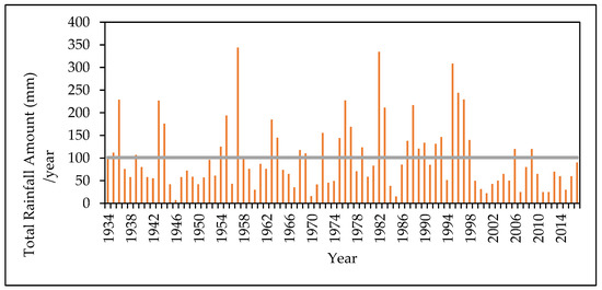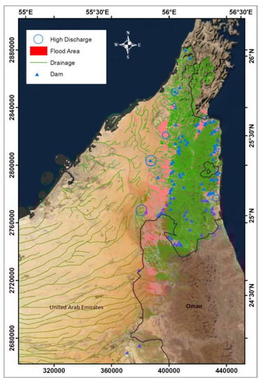 According to IPCC [23] projections, most mid−latitude land masses and wet tropical regions may experience high precipitation events with greater intensity. This change has been observed in the Arabian Peninsula since 2015. For example, in the UAE, except for the water year 2020–2021, there has been a general increase in the total annual precipitation, combined with major changes in precipitation patterns since 2016. The total annual precipitation in wet years such as the water years (e.g., 2019–2020 and 2021–2022) was more than double the average rainfall in all the northern and eastern parts of the UAE. The total rainfall in the water year 2019–2020 reached 500 mm in the area east of Al Ain city (Figure 2a), with a deviation from normal rainfall of 300 mm (Figure 2b).