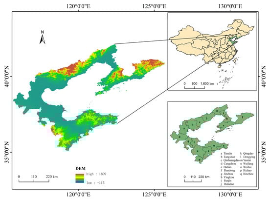 The Bohai Sea region is one of the three major maritime economic regions in China (Figure 1). Owing to its advantageous geographical location, rich and diversified resources, and progressive industry and technology, it has become the backbone of China’s maritime economic development. Before the background of accelerating the high-quality development of China’s marine economy, the evaluation of the sea–land integration ecological economy in cities around the Bohai Sea has important theoretical value and practical significance for accurately understanding the current scenario of the sea–land economic development of coastal cities and formulating measures that conform to the differences between regions. From a systems perspective, the integration of the marine and terrestrial ecological economies is an emerging system of continuous change formed by interconnection, intersection, penetration, competition, and collaboration among several sub-system components within the sea–land interface and its complex system in the spatio-temporal dimensions [22,23]. Considering its complexity, the sea–land issue should be comprehensively analysed and studied. Based on previous study results, this study used the framework of system theory to introduce the viscosity theory as a guide for the in-depth analysis of a mechanism and model for the integration of sea and land ecological economies. This was combined with a structural chart of the marine ecological economic system, and an evaluation index system was constructed for integrating marine and land ecological economies in cities around the Bohai Sea [24,25].