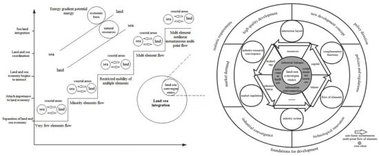 A system is a set of interrelated elements. Studying the problem from a systems perspective may allow for an optimised and comprehensive determination of the problem and an accurate understanding of the ecological economy of sea–land integration. Furthermore, the sea–land economy is a system structure comprising several sub-system elements within a complex system [34,35,36,37]. Industrial integration is a trend in economic development, and its formation requires open systems as a prerequisite as well as innovation as an opportunity, competition and collaboration between subjects, co-evolution between elements, and other external factors that contribute to the integration process. The economic integration of land and sea is attributed to the change in strategic thinking and the advancement of science and technology. Furthermore, the economic relationship between land and sea is closely linked, fundamentally owing to the coexistence and mutually beneficial relationship between sea and land industries. Furthermore, the layout of the industries requires both a marine resource supply and land area as a base; production factors need to flow between sea and land areas and among industries [38,39,40].