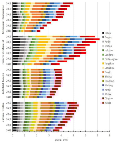 Table 2 shows that, from 2009 to 2019, the development level of the ecological economic sea–land integration in Bohai Rim cities was generally increasing; however, the magnitude varied significantly between cities. The value of the development level of ecological economic sea–land integration in Bohai Rim cities ranged from 1.333 to 3.613 and increased from 2009 to 2018, with a slight decrease in 2019. Although the trends of all cities increased, each city exhibited a different starting point and rate of increase, with some cities showing a large fluctuating upward trend, most cities showing a small fluctuating rise, and all cities ranging between 0.017 and 0.186, including Weifang, Weihai, Cangzhou, Dongying, Rizhao, Binzhou, Qinhuangdao, Yingkou, Jinzhou, Dandong, Panjin, and Huludao—all cities with a high starting point. The cities that exhibited a large increase included Tianjin, Qingdao, Dalian, Yantai, and Tangshan, with Tianjin exhibiting the highest value among cities. This value increased to 0.883 after 2011, until 2017 when it slightly dropped. Qingdao and Dalian exhibited an upward trend during the early stage; however, after 2014, the Dalian value began to fluctuate more. After 2015, Qingdao surpassed Dalian and continued to stabilise. After 2015, Qingdao surpassed Dalian and continued to grow steadily until it reached 0.658. Despite a slight increase, the subsequent value for Dalian significantly differed from that for Qingdao. Furthermore, in 2019, when the level of most cities declined, Dalian was surpassed by Yantai and was almost on par with Tangshan. Figure 3 shows that in terms of the proportion of each city’s effectiveness in the sub-system layer, the integration economy development foundation layer remained high and increased steadily. The integrated economy resource development layer had a low value of effectiveness and grew gradually; the integrated economy industry linkage layer exhibited the highest growth and the highest value of effectiveness but with small fluctuations. The integrated economy outcome creation layer had a low starting point but remained relatively stable and then exhibited rapid growth. Among the systems, the development base was relatively stable, level of resource development was low, industrial linkage effectiveness value was high and rapidly developing, and outcome creation was influenced by the first three to show a comprehensive low level of rapid growth. In the proportion of cities in each system in each year, the cities with a high starting point and a large increase in the level of development of the ecological economy of land and sea integration were Tianjin, Qingdao, Dalian, and Yantai; these cities accounted for a relatively high proportion in each layer of the system. Tangshan accounted for a smaller proportion than the four aforementioned cities in the development of resources and the creation of outcomes but accounted for a larger proportion in industrial linkages and an increasing proportion in the creation of outcomes, indicating that this city plays a more optimised role in industrial linkages and makes full use of its benefits.