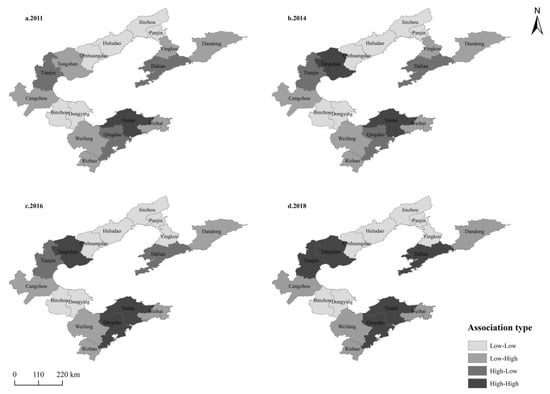 In terms of relative length (Figure 4), during the study period, Yantai maintained the H–H spatio-temporal association and a more stable agglomeration effect. In 2011, Dalian, Qingdao, and Tianjin exhibited the H–L type of association, indicating that big cities had not formed a kind of agglomeration drive at the time. The surrounding cities remained in the L–L type or L–H type. In 2018, three H–H type agglomerations were formed in the north, centre, and south, containing Dalian, Tianjin, Tangshan, Qingdao, and Yantai as the central cities. The distribution of the L–L type associations was relatively stable and followed the line from Qinhuangdao to Yingkou, including the two adjacent cities of Binzhou and Dongying. Only Yingkou was of the L–H type before 2014 and became L–L after 2018, a phenomenon that indicates the reduced aggregation effect of adjacent large cities. The distribution of cities in the local spatio-temporal heterogeneity H–L and L–H types was more dispersed and relatively variable, with Qingdao in 2016 and Dalian and Tianjin in 2018 entering the H–H type association from the H–L type. These three cities are surrounded by the dispersed distribution of Dandong, Cangzhou, Tangshan, Weifang, Rizhao, and Weihai, L–H type cities, with Tangshan entering the H–H type association from the L–H type in 2014.