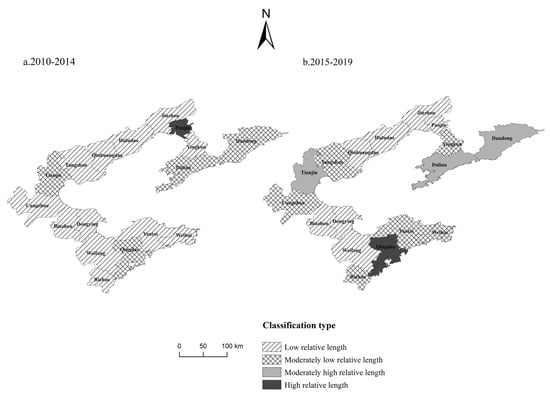 In terms of relative length (Figure 5), the local spatial structure of the ecological economy of sea–land integration in Bohai Rim cities was highly stable. Panjin was a high relative length city in 2010–2014 and was highly unstable. Dandong, Dalian, Tianjin, and Qingdao had a moderately low relative length and more stable local spatial structure; most cities were of low relative length and had a highly stable local spatial structure. The number of cities with high relative lengths remained relatively unchanged from 2015 to 2019; however, Qingdao and Panjin significantly shifted to have low relative lengths. Dandong, Dalian, and Tianjin shifted to a moderately high relative length, and Yingkou, Tangshan, Cangzhou, Rizhao, Yantai, and Weihai shifted from low relative lengths to moderately low relative lengths. Qingdao, Tianjin, and Dalian shifted to moderately high relative lengths and high relative lengths, and the local spatial structures had a strong dynamic in which their aggregation effects increased, further contributing to their driving radiative role to surrounding cities which have low relative lengths (from 12 to 7), primarily including Tangshan, Yingkou Line, Cangzhou, and the Rizhao region. The local spatial structure in these cities was the most stable, primarily because these cities have a similar urban base. The low and moderately low relative lengths were 15 and 13 in the two periods, indicating that the Bohai Rim is an area with a stable ecological and economic local spatial structure of land and sea integration.