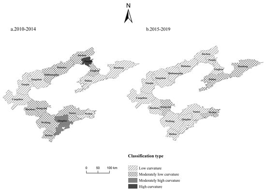 In terms of curvature (Figure 6), the process of local spatially dependent change in the ecological economy of sea–land integration in cities around the Bohai Sea is stable. From 2010 to 2014, Panjin, a high-curvature city, had the most volatile process of local spatial dependence; Qingdao, a moderately high-curvature city, had more volatile growth and local spatial dependence; Dandong, Dalian, Tangshan, Tianjin, Cangzhou, and Weihai, low-curvature cities, had the most stable growth and local spatial dependence; and the remaining cities were all moderately low-curvature. From 2015 to 2019, Dalian, Dandong, and Weihai evolved into moderately low-curvature cities; the number of low-curvature cities increased from 6 to 13, showing an upward trend. Regarding spatial distribution, high curvature and moderately high curvature cities disappeared, and low curvature cities showed a clear trend of contiguity in their spatial distribution.