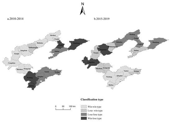 The LISA time path movement directions can be used to reveal the spatial integration characteristics of the changes in the local spatial patterns of geographical elements. By comparing the positions of Moran’s I scatter diagrams in 2010, 2014, 2015, and 2019, the movement directions of LISA coordinates in Bohai Rim cities were calculated and classified into four categories, among which 0–90° was the mutually beneficial type, indicating a synergistic positive growth trend of geographical elements in a region and its neighbouring regions; 90–180° and 270–360° were lose–win and win–lose types, respectively, indicating a reverse growth trend; and 180–270° was a lose–lose type, indicating a synergistic negative growth trend. The results are shown in Figure 7.
