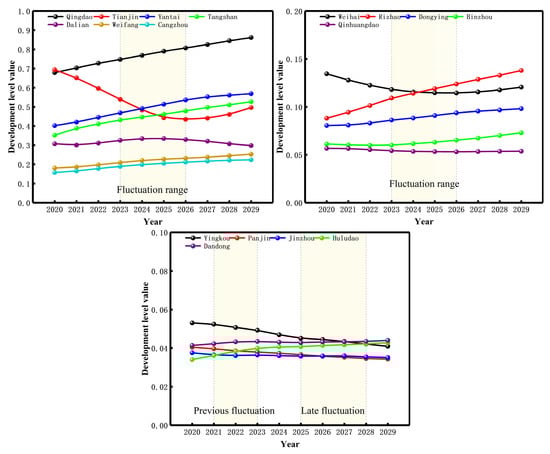 The predicted development level of economic integration between sea and land in Bohai Rim cities is divided into three levels: the high-, medium-, and low-value zones. As shown in Figure 8, the high-value zone contains Qingdao, Tianjin, Yantai, Tangshan, Dalian, Weifang, and Cangzhou, with fluctuations primarily between 2023 and 2026, Yantai and Tangshan increasing more than Tianjin, Tianjin decreasing and then increasing again, and Qingdao maintaining a high level. The medium-value zone contains Weihai, Rizhao, Dongying, Binzhou, and Qinhuangdao, with fluctuations primarily between 2023 and 2026. In 2023–2025, the development level of Rizhao exceeds that of Weihai, whereas that of the other cities remains relatively stable. The low-value zone contains Yingkou, Panjin, Jinzhou, Huludao, and Dandong, and it has a smaller overall value range and smaller fluctuation areas. In the low-value zone, Huludao increases more than Jinzhou and Panjin during 2021–2023, Yingkou declines, and Dandong and Huludao increased from 2015–2018. Overall, the forecasted values for the level of economic integration between sea and land in Bohai Rim cities maintained the trend and pattern of the original study period, with several high-value cities remaining at a high level and some cities having smaller differences between fluctuations.