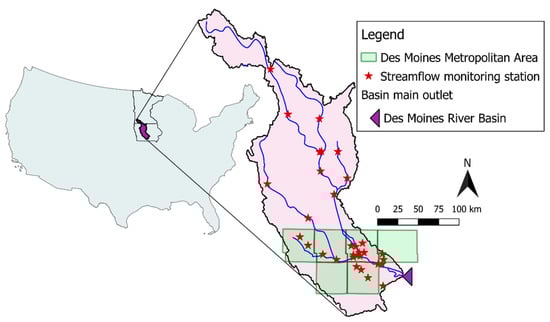 Locations of the Des Moines River Basin in Iowa and Minnesota, USA, the Des Moines Metropolitan Statistical Area, and streamflow monitoring stations.