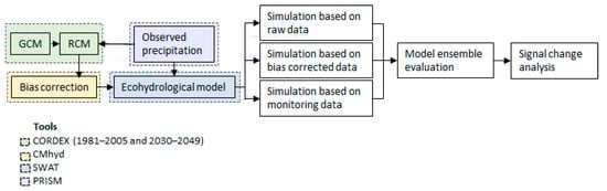 We evaluated monthly projections of two Global Climate Models (MPI-ESM-LR and GFDL-ESM2M) coupled with two Regional Climate Models (WRF and RegCM4) and the RCP Scenario 8.5 for a future period of 2030–2049 []. Corresponding data for the historical period 1981–2005 were used as input for the SWAT model to identify hydrological climate change signals with a focus on surface runoff and water yield. Model integration occurred when the output data of a coupled GCM-RCM (precipitation) were used as input data for the SWAT model. The bias correction effect was assessed by correcting projected precipitation and comparing results for the historical and future runs, and climate change signals with those obtained using a non-corrected (raw) climate scenario (Figure 2).