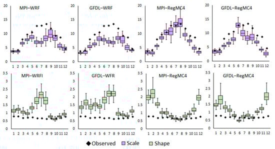Figure 3 shows monthly variably of the shape (α) and scale (β) Gamma distribution parameters fitted. The shape parameter average for the observed data is below 1, indicating an exponentially shaped distribution; however, the climate models presented an average fitted distribution greater than 1 in half of the cases, indicating a skewed unimodal distribution curve. When comparing the models, α was better adjusted for RegCM4 combinations. The WRF combination showed better agreement from September to December (with the addition of April for the MPI-WRF combination), and the RegCM4 from April to October. The scale parameter can indicate the probability of extreme events. Smaller values guide to lower probabilities, while larger values imply higher probabilities []. The WRF models had a good fit during the winter months; however, the difference is substantial during the rest of the year. The RegCM4 parameters’ distribution showed similar patterns for both models, the MPI-RegCM4 computing the smaller difference between the distributions on average.