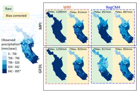 Spatial representation of observed annual precipitation (1981–2005), raw climate data, and bias-corrected climate data. The * refers to the replacement of the maximum rainfall value (in the legend) for each model.