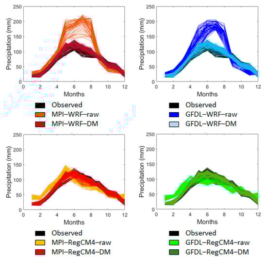 In addition to spatial variability, an accurate representation of temporal variability (seasonality) is essential, especially to analyze climate change impacts for regional studies. Monthly precipitation was overestimated for all raw models from January to April, and the level of agreement between observed and historical climate projections varied considerably for the two RCM models, with RegCM4 resulting in a better fit (Figure 5). The WRF model’s tendency to overestimate was also apparent at a monthly scale. The WRF model greatly overestimated precipitation from January to August; however, it underestimated precipitation volumes from September to November. In general, the DM bias correction improved monthly precipitation estimates for all GCM-RCM combinations (Figure 5).