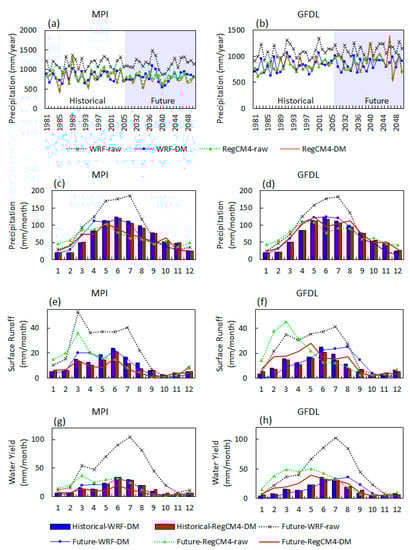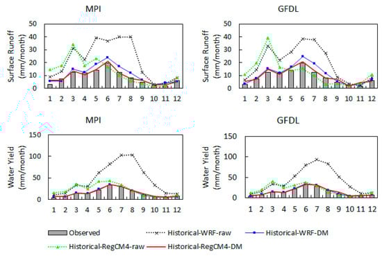 Initial overprediction and better agreement after the DM was applied also occurred for surface runoff and water yield. More specifically, raw models tended to overpredict surface runoff and water yield, mainly for January to April, and the bias correction provided better agreement for all models, improving their seasonal predictions. After DM application, water yield estimates for MPI/GFDL-WRF and MPI/GFDL-RegCM4 were statistically the same; however, the surface runoff was better represented by the RegCM4 combination (Figure 7). Judging by historical data, the DM method is useful and can overcome various problems (spatial variation, volume estimation, and seasonality) associated with the GCM-RCM model applications. However, good historical representation does not necessarily mean better future prediction. A common use of climate model projections is for future conditions and the corresponding ability to represent hydrological and/or pollutant variables for ecohydrological models such as SWAT (e.g., regional climate change impact studies).
