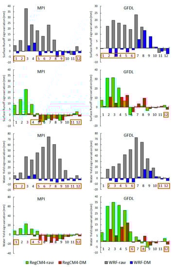 Representation of monthly future projections and changes in prediction signals for surface runoff and water yield. Each figure shows a GCM-RCM combination of raw and bias-corrected data; the orange squares indicate months where changes in prediction signal occur.