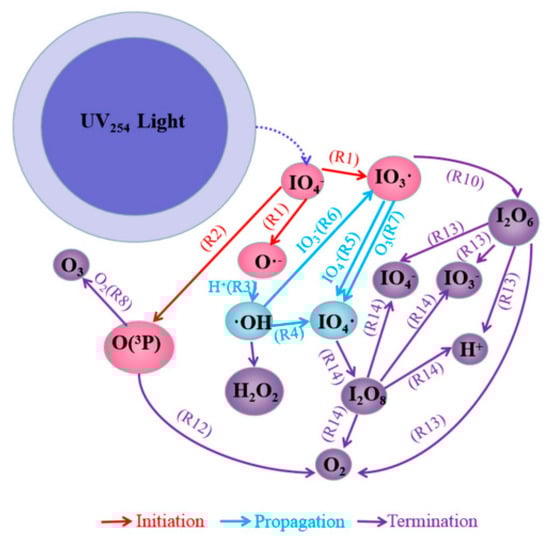 Schematic UV/IO4− process radical and reactive species production, transformation, and interconversion. Reprinted/adapted with permission from Ref. []. 2023, Elsevier.