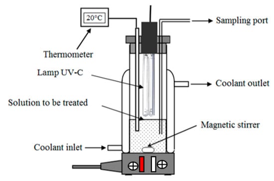 A batch photoreactor with a capacity of 500 mL was adopted for the AO10 degradation experiments. A thermocouple was inserted into the reaction medium to measure the temperature of the solution. The temperature within the reactor was controlled at 20 ± 1 °C by circulating water in a cooling jacket surrounding the reactor. A 25 W low-pressure mercury lamp (intensity: 15 mW/cm2) with a maximum emitting wavelength of 254 nm was adopted to deliver UV-C irradiation for the experiment. A quartz tube housed the UV-C lame (Figure 2). This was later positioned at the center of the cell, 2 cm above the bottom.