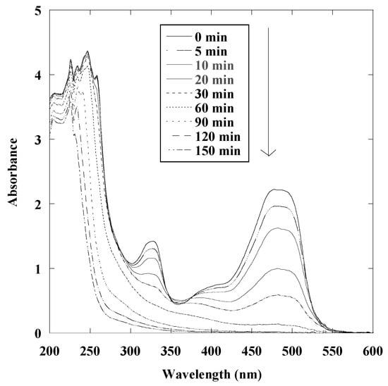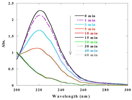 Figure 3 shows how UV irradiation of IO4− aqueous solution (neutral pH, without AO10) affects the UV absorption spectra (especially λmax = 221 nm of periodate). As the UV light was delivered to the solution, the concentration of the periodate ion dropped over the first 10 min to 0.5% of its initial concentration (absorbance). These outcomes confirm the rapid photodecomposition (at 254 nm) of periodate ions into reactive species and by-products. The same observation was previously reported by other research, working at different operating conditions [,].
