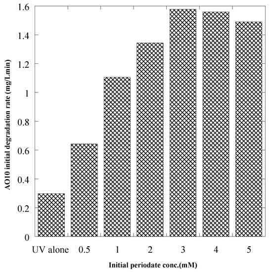 Many runs were carried out to investigate the degradation of AO10 (50 mg/L) under the sole UV exposure (data not shown). Roughly 300 min of treatment time is required to completely degrade the dye under the investigated conditions (i.e., 50 mg/L). Extended treatment times are undoubtedly detrimental in terms of reduced UV lamp lifetime. Therefore, the presence of photoactivated periodate ions was contemplated to compensate for this inconvenience and gain better degradation results. Figure 4 shows the initial degradation rate of AO10 (mg/L min) calculated over the first 5 min, both under sole UV irradiation and in the presence of periodate at different initial concentrations, and natural pH (5.4).