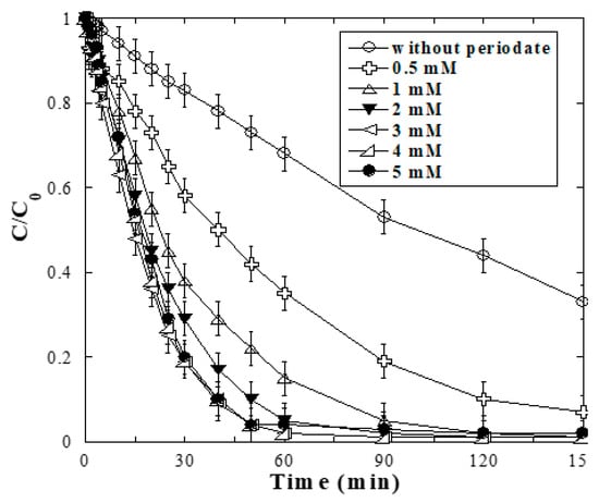 Figure 5 elucidates the whole C/C0-concentration evolutions (for 150 min), in the absence and presence of periodate (same dosages of Figure 4). An increase in AO10’s removal (%) was observed due to the IO4− presence. After 90 min of UV exposure, the removal efficiency rose from 47.15% to 81.50, 95, 98.10 and 99.20% when [IO4−]0 was used at 0.5, 1, 2 and 3 mM. High periodate load (but <3 mM) may boost IO4−-incident light absorption and generate more •OH and IO3• that react with AO10, resulting in an increase in the degradation rate. It is interesting to note that the degradation process occurs slowly at low IO4− concentrations but speeds up when the IO4− concentration rises since IO4− could produce byproducts such as IO3• and •OH via Reaction (6). However, Reaction (11), which has a high-rate constant of 7.6 × 108 M−1 s−1 [], is a significant parasitic reaction that slows down the degradation of the dye at heavily loaded periodate (5 mM). Hamdaoui and Merouani [] and Ghordbane and Hamdaoui [] reported the same detrimental effect of high IO4− concentrations on the sono-degradation and photo-destruction of many dyes.