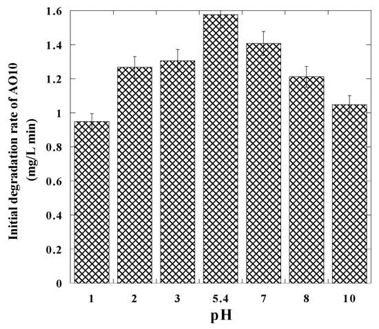 In the present work, a pH range of 1−10 was selected to examine the effect of this parameter on UV/IO4− treatment for the remediation of AO10 (C0 = 50 mg/L) by adopting an IO4− concentration of 3.0 mM. Results reported in Figure 6 indicate that the degradation rate increased with pH increase from 1 to 5.4 and then decreased afterward. The lowest degradation rate was observed at pH 10. At pH < 8, IO4− species dominated, while the dimerized form, H2I2O104−, was the dominant species above pH 8. Under acidic conditions (pH 1–3), the reduction of the initial degradation rate of AO10 by UV/IO4− could be linked to the presence of H+ and SO42− ions arising from the addition of sulphuric acid []. These anions may act as radicals’ scavenger, thereby altering the degradation process. At pH 5.4, the concentration of these species is lower, which increased the probability of radical quenching by the dye molecules instead of the mineral anions. It should be noted that acid dyes are usually used for dyeing wool and nylon. Our process is typically carried out in an acid medium because it is necessary to produce positively charged fibers by protonation. This way, the dye is mainly fixed to the fiber by electrostatic forces.