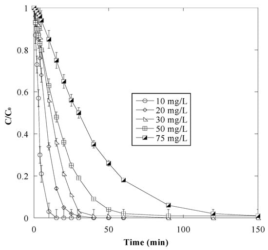 Effect of initial AO10 concentration on its degradation ([A010]0 = 10–75 mg/L, 20 ± 1 °C, [IO4−] = 3 mM, initial pH 5.4, irradiation intensity: 15 mW/cm2).