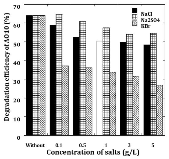 Three common anions (Cl−, SO42−, Br−) were used to investigate the impact of water constitutes on the degradation of AO10 by UV/IO4−. Figure 9 depicts the degradation of AO10 under various conditions as the concentrations of the three anions rose from 0 to 0.1, 0.5, 1, 3, and 5 g/L. As a general comment, all the anions showed a detrimental effect on AO10 degradation, which is generally marked at increasing salt concentration. Among the tested ionic species, chloride produces a minor reduction of the degradation efficiency of AO10, while it is significantly reduced in the presence of SO42−. The removal of AO10 was 58.97, 52.42, 50.45, 49.78 and 48.34%, at Cl− concentrations of 0.1, 0.5, 1, 3 and 5 g/L, respectively, whereas the removal rate was 64% in absence of Cl−. The inhibited degradation of AO10 was related to the ability of Cl− (at high concentration) to react with •OH (scavenging role) []. Chloride ions also react with iodine radicals to a certain extent []. These reactions result in the production of a radical less reactive than •OH and iodine radicals (i.e., HOCl•−) []. According to Bendjama and colleagues [], chloride did not affect the interaction of CB with iodine radicals generated by UV light at seawater concentrations (500 mg/L). Contrary to chlorine ions, sulfate did not alter significantly the degradation of the dye, even in the presence of high SO42− dosage, which is probably because sulfate ions are generally eco-friendly to reactive oxidants in most AOPs []. The most inhibiting impact is that retrieved in the case of bromide ions. AO10 removal fell from 64.08% without KBr to 24.60, 27.35, 26.56, 23.21 and 23.13%, respectively, with KBr addition at 0.1, 0.5, 1, 3, and 5 g/L, confirming the effective inhibition in the degradation of dye (Figure 9). A similar generated trend (to that of bromide ions) was reported by Chadi et al. [], which treated Toluidine Blue dye by H2O2/IO4− process (periodate is activated by H2O2 in this process).