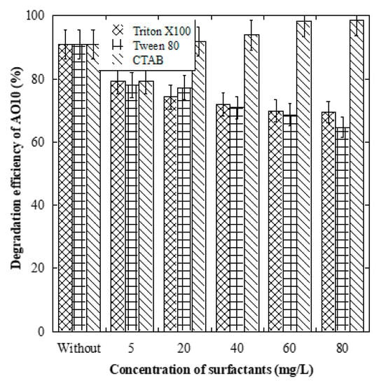 In contrast to prior experimental observations generated from Triton X100 and Tween 80, CTAB (a cationic surfactant) runs indicate that a partial loss of AO10 degradation efficiency occurs only at a surfactant concentration of 5 mg/L. Moreover, the removal of the dye pollution was facilitated by increased CTAB concentrations. Using CTAB to remove ketoprofen, ibuprofen and diclofenac from wastewater, Liu et al. [], got comparable results. Without a surfactant, the removal efficiency of ibuprofen, diclofenac and ketoprofen by the ECF method was reduced (44, 14 and 10%, respectively), while the addition of surfactant greatly enhanced the removal capacity of diclofenac, ibuprofen and ketoprofen from 12 to 97%, 12 to 88% and 6 to 82%, respectively.