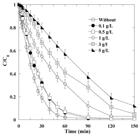 Overall, the results show the effectiveness of adding periodate in the liquid medium for accelerating the initial degradation rate of the dye pollutant. The initial degradation rate of AO10 was about 0.3 mg/L min when adopting only UV irradiation; this value was multiplied by 3.7 and 5.5-fold in the presence of IO4− at 1 and 3 mM, respectively. However, raising IO4− concentration above 3 mM had a limited impact on the dye degradation rate because of the scavenger role played by periodate (when it is in excess) toward free radicals []. It is important to stress here that periodate alone (without UV) did not affect the dye removal for up to 60 min. Therefore, the obtained synergic effect resulted mainly from the photoactivation of IO4−, which yields reactive contributions (as stated in the introduction).