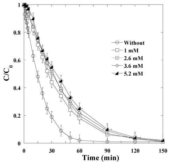 Photolysis of IO4− generates reactive species such as O(3P), •OH, IO3• and IO4•, as discussed before. In this work, tert-butanol was utilized as a specific scavenger of hydroxyl radical (OH) and O(3P) during degradation of AO10 in the UV/IO4− system []. It is shown in Figure 13 how different concentrations of the alcohol tert-butanol (at 1, 2, 6, 8, and 10 mg L−1) affect the degradation of 50 mg/L AO10. The degradation rate of AO10 slightly falls when tert-butanol is present, which indicates that both •OH and O(3P) play a limited part in the degradation of the dye and that the degradation process of AO10 in the UV/IO4− system is not dominated by a •OH and O (3P) pathway. IO3• and IO4• are much more critical in degrading dye than •OH and O(3P). A similar statement has been developed by Chia et al. [] for the degradation of 4-chlorophenol.
