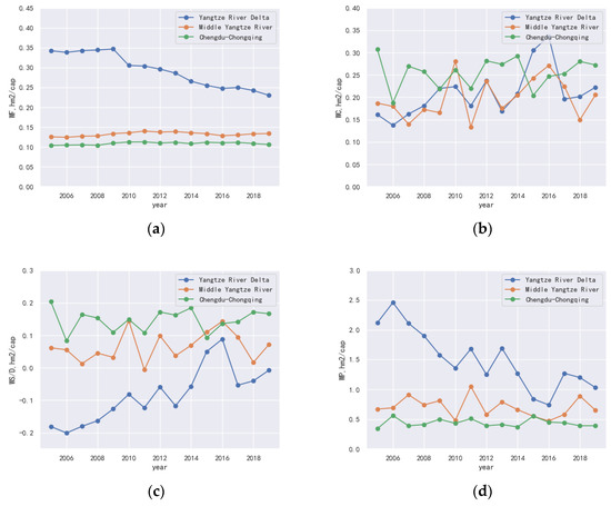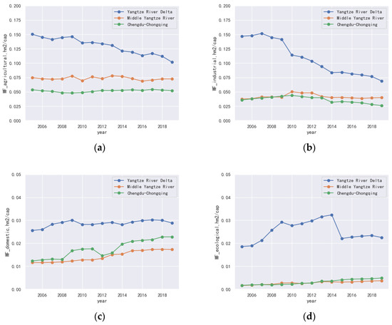 In terms of the WEF for domestic use, Figure 2c shows that the three urban agglomerations in descending order are the Yangtze River Delta, Chengdu–Chongqing, and the middle Yangtze River. The domestic WEF of the Yangtze River Delta urban agglomeration increased from 2005 to 2009 and remained generally stable after 2009. The Chengdu–Chongqing urban agglomeration maintained an increasing trend in all years except for 2012 when there was a significant decline. The middle Yangtze River urban agglomeration experienced stable but slow growth during the study period.