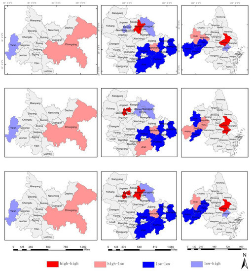Spatial correlation analysis of urbanization and WEF. Note: The top, middle, and bottom three sub-figures represent the result of population urbanization, economic urbanization, and land urbanization, respectively. For each of three sets of sub-figures, from the left to the right are the three urban agglomerations of Chengdu–Chongqing, the Middle Yangtze River, and the Yangtze River Delta.