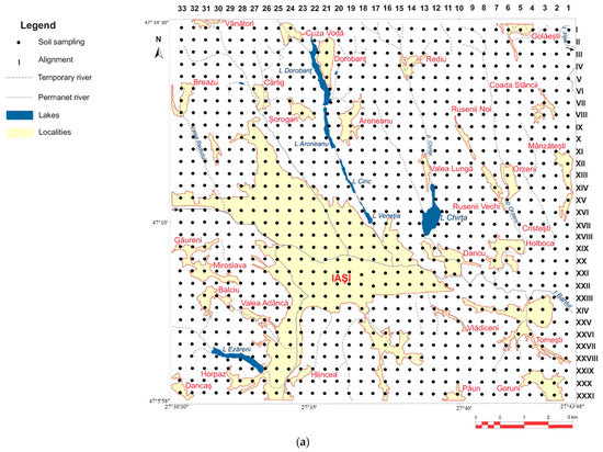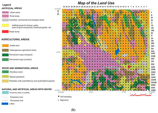 (a) Sample collection grid from the study area (16 km2) including the built-up area of Iasi and its surroundings (1030 soil samples were taken at a depth of 0–25 cm from a network of 500 m); (b) land use.