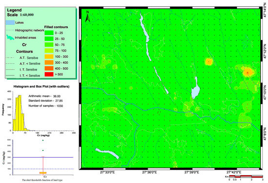 Chromium is recognized to have lithophile geochemical affinity [53]; the maximum recommended value for total Cr content in soil is 30 mg kg−1. The alert threshold (AT) for sensitive land (SL) use is 100 mg kg−1, and for less sensitive land (LSL), it is 300 mg kg−1. The distribution of Cr in the investigated soils appeared to be very close to the natural state, because 99.32% of the samples showed values within the normal range, whereas those that exceeded the alert threshold represented only 0.68% of samples, and those that exceeded the intervention threshold (IT) represented 0.48% of samples (Figure 2).
