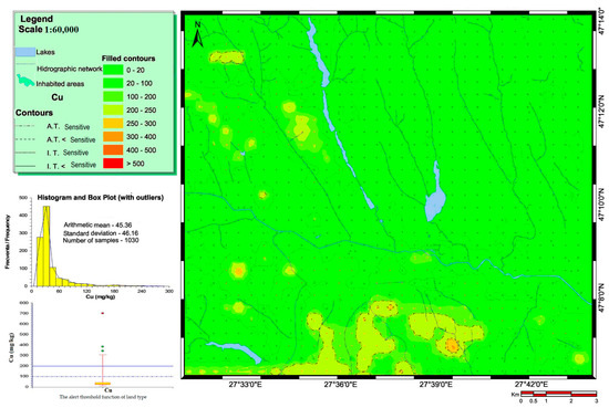 Copper has a chalcophile affinity that leads to its association in some minerals and ores with other heavy metals such as Pb, Zn, Mo, Ag, and Ni [54]. In the topsoil, a good correlation exists between Cu and Al, Ni, Cr, Mn, and Zn. The maximum recommended value for the total content of Cu in soil is 20 mg kg−1. The AT for SL is 100 mg kg−1, and for LSL, it is 250 mg kg−1. The IT is at 200 mg kg−1 for SL and 500 mg kg−1 for LSL (Figure 3).