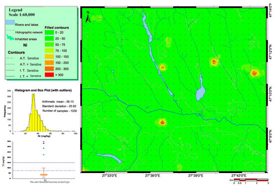 Nickel has a chalcophile geochemical affinity, the latter explaining the association of Ni with Co, Cu, and Pt in some sulphide ores [55]. The maximum limit for total Ni content in soil is 20 mg kg−1. The AT for SL use is 75 mg kg−1, and for LSL use, it is 200 mg kg−1. The IT is 150 mg kg−1 for SL and 500 mg kg−1 for LSL. Throughout the studied soil profiles, the Ni content is presented in Figure 4. Samples for which the Ni content exceeded the alert threshold have a punctuated arrangement in the investigated area, an arrangement that is spatially related to the occurrence of chernozems.
