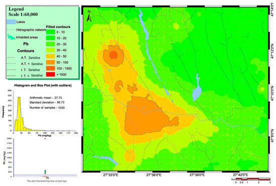 Lead has a geochemical affinity for chalcophiles [56], which explains why it is found in sulphide ores with Fe, Zn, Cu, Sb, and Ag. The maximum limit for total Pb content in soil is 20 mg kg−1. The AT for SL is 50 mg kg−1, and for LSL land, it is 250 mg kg−1. The IT is 100 mg kg−1 for sensitive land and 1000 mg kg−1 for less sensitive land. The Pb content determined in the study area varied within a fairly wide range, from 4.5 to 1995.4 mg kg−1 (Figure 5).