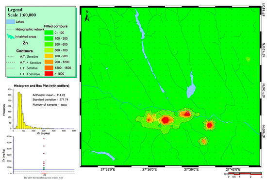 Zinc interacts with several heavy metals, including Cu, Pb, Ag, Au, Sb, As, and Se, in certain sulphide ores [57]. The maximum recommended limit for the total Zn content in soil is 100 mg kg−1. The AT for SL is 300 mg kg−1, and for LSL, it is 700 mg kg−1. The IT is 600 mg kg−1 for SL and 1500 mg kg−1 for LSL. Since zinc is a necessary nutrient for most plants, algae in rivers and lakes may absorb most of the dissolved zinc in water. However, excessive zinc in soils can be hazardous to many plant species. The Zn content determined for soils from Iasi city and its surroundings varied widely (10.1–5624 mg kg−1), with a majority of samples (96.5%) in which the content did not exceed normal values for soils. Samples with a Zn content that exceeded the AT (2.04%) and were higher than the IT (1.46%) belonged to soils in the urban areas with a southern exposure. Differences in the Zn content spatially overlapped mostly with those of Pb, suggesting that they were generated by the same common pollutant sources (Figure 6). In the study area, soil pollution was characterised by the presence of three heavy metals, Pb, Zn and Cu, above the recommended limits.