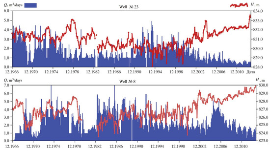 To begin, data must be selected and grouped. Thus, for the observation period from 2008 to 2020 (150 observations) we divided the series into three equal segments (50 values each). Differences in the means of the series are insignificant (t = 0.96, df = 98, p > 0.05), where t is Student’s t-test, df is the degree of freedom, and p is the level of significance. The data was grouped by 100 observations; as an example two segments were chosen (2004–2012 and 2012–2020). The differences in the means of the series are also insignificant (t = 0.64, df = 198, p > 0.05). Thus, the stationarity of the time series according to the observation well data is proven. A number of other control wells of the field were analyzed using the same methods.