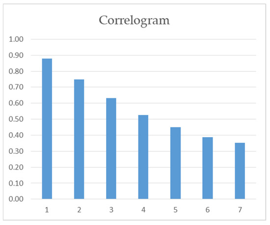 For the analysis of a series of dynamics of the piezometric level from observation well No. 87 in the field using the correlogram, it is necessary to supplement the initial series of dynamics with series from the levels of this series shifted in time (Table 2). Calculating the correlation coefficients of the initial series Yt with other ones, a resulting correlogram can be presented in the following form in Figure 3. Since the first-order autocorrelation coefficient turned out to be the highest, the time series contains a trend. As the delay increases, the correlation monotonically decreases, which indicates the stationarity of the series, the probabilistic properties of which do not change with time. To confirm the results, the second method was used for estimating the stationarity of the series.