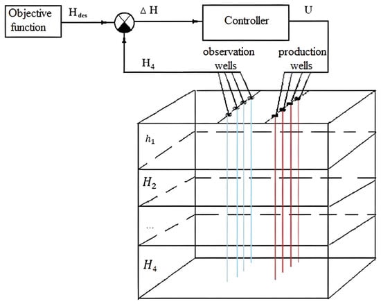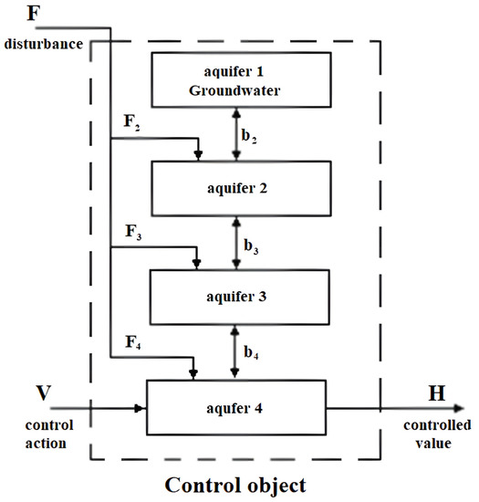 Schematic model of the field as a control object. F—flow velocity in the aquifer (disturbance); V—decrease in the piezometric level at the locations of production wells (control action); , —sums of deterministic and random components of processes; bi—overflow parameters (constant coefficients obtained experimentally on a real object, characterizing the rate of fluid overflow through aquicludes between layers); H—head in the aquifer (controlled value at the points of location of control wells).
