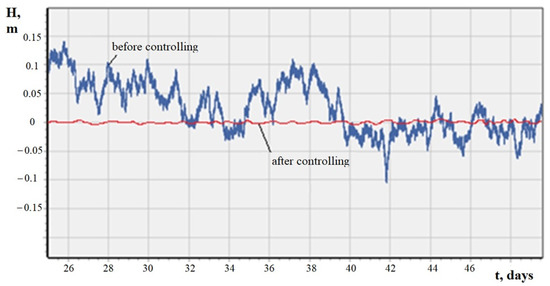 It is worth noting how small the effects of random disturbances on the control system are. Comparison of the random signal at the output of the system and at the output of the object before applying the distributed controller in Figure 9 illustrates that the random effect was reduced (from ±0.15 m to ±0.005 m).