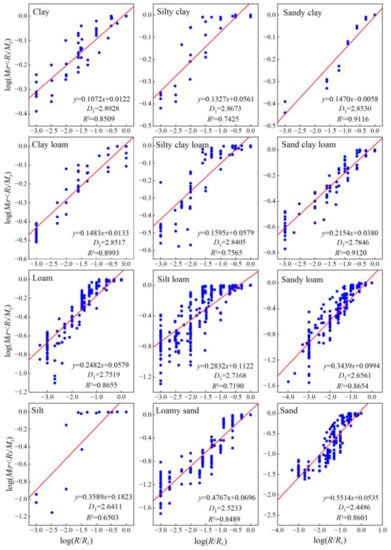 Equation (10) is the fractal model based on particle mass distribution established by Tyler and Wheatcraft [56], and the D1 in Equation (10) is the mass particle fractal dimension. Through the linear fitting calculation of Equation (10), taking M (r > R)/MT and R/RL as the vertical and horizontal coordinates, respectively, the mass fractal dimensions with different soil textures can be obtained.