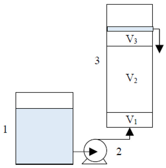 Column experimental setup: (1) CrVI solution storage tank; (2) peristaltic pump; (3) column with V1 (sand 1.2–2.0 mm, 5.0 cm3), V2 (reactive zone) and V3 (sand 0.5–1.2 mm, 5.0 cm3) layers.