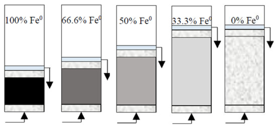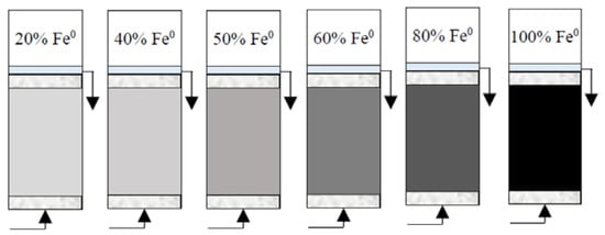 (2) Reactive zone with variable Fe0 volume/mass (10 cm3/40 g, 20/80 g, 25 cm3/100 g, 30 cm3/120 g, 40 cm3/160 g and 50 cm3/200 g) and fixed total volume V2 (50 cm3) (Figure 3). These reactive zones corresponded to the following Fe0 volumetric percentages: (a) 100% (50 cm3 Fe0 only), (b) 80% (mixture of 40 cm3 Fe0 + 10 cm3 sand), (c) 60% (mixture of 30 cm3 Fe0 + 20 cm3 sand), (d) 50% (mixture of 25 cm3 Fe0 + 25 cm3 sand), (e) 40% (mixture of 20 cm3 Fe0 + 30 cm3 sand) and (f) 20% (mixture of 10 cm3 Fe0 + 40 cm3 sand).