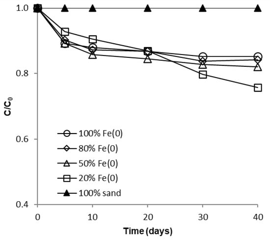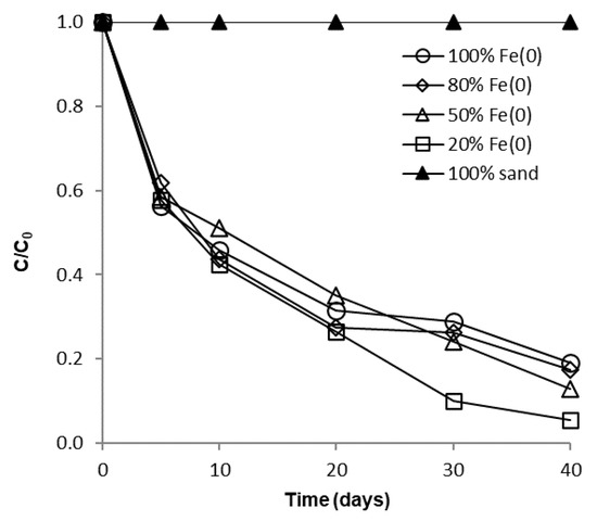 Even though well-designed batch experiments (i.e., non-disturbed or slowly shaken) can be useful in fine-tuning some relevant aspects at the laboratory scale, the most effective method of investigating the efficacy of Fe0 filtration systems, which delivers experimental data with the best transferability to real water treatment systems (e.g., PRBs, SONO filters), is via flow-through column experiments [14,43,44,45]. To the best of our knowledge, to date, there are only a few such studies which may be considered for finding an answer to the aforementioned question. From the work of Westerhoff and James [43], it seems that a column packed with a mixture of 50% Fe0 and 50% sand (w:w) (feed solution: 5–16 mg N/L; bed contact time: 1.5 h) was at least equally effective in removing NO3− as a column with 100% Fe0 (feed solution: 2–5 mg N/L; bed contact time: 1.1 h); however, this conclusion is questionable since experimental conditions were not equal for the two columns. The study of Kaplan and Gilmore [46] specifically investigated, under continuous-flow conditions, the effect of sand co-presence on kinetics of CrVI removal with Fe0, reporting that varying the Fe0 content in the column between 20 and 100% (weight) had no significant effect on the magnitude of the kobs.