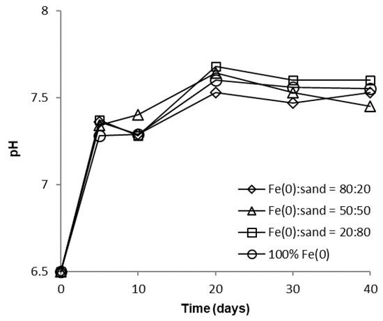 Over the course of batch experiments, pH increased from 6.5 to 7.5–7.7 and 7.4–7.5 for tests at low and high CrVI concentration, respectively (Figure 6 and Figure 7); the increase was more rapid for experiments at low CrVI concentration and rather sequential for tests at high CrVI concentration. No significant differences were observed between the final pH values (after 40 days) in the “Fe0 + sand” and the “Fe0 only” system. The pH increase was the result of: (1) HO-generation in Fe0 oxidative dissolution processes (Equations (1) and (2)), mainly due to oxidation with water, and (2) H+ consuming reactions (Equations (3)–(5)), mainly due to indirect reduction of CrVI with dissolved or solid FeII-based corrosion products [54].
