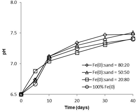 Three different systems were investigated: (1) Fe0 + sand (1.2–2 mm), (2) Fe0 only, and (3) sand only (1.2–2 mm). Two types of reactive zone (V2) containing Fe0 were explored: