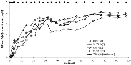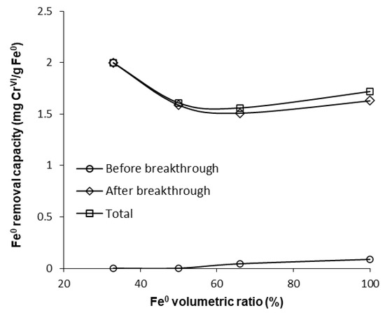 However, a comparison of the capacity of “Fe0 only” and “Fe0 + sand” systems to remove CrVI adds other important information, which counterbalances the aforementioned presumption. It can be seen from Figure 9 that the highest total CrVI removal capacity was observed for the 33% Fe0 system. The 100% Fe0 system exhibited the second best total CrVI removal capacity, higher than columns with 50% and 66.6% Fe0, but lower than the 33.3% Fe0 system. Therefore, it clearly results from these experiments that even though the 33.3% Fe0 system exhibited the fastest CrVI breakthrough, it displays the highest total CrVI removal capacity; this can be ascribed to the fact that the 33.3% Fe0 system showed the lowest value of CrVI in column effluent from day 25 till the end of the experiment. This behavior may be important, for instance, when treated water is blended in a certain proportion with clean water from a different source, and typical quality regulations are still achieved for the resulting mixed water in spite of CrVI breakthrough in the treated water.