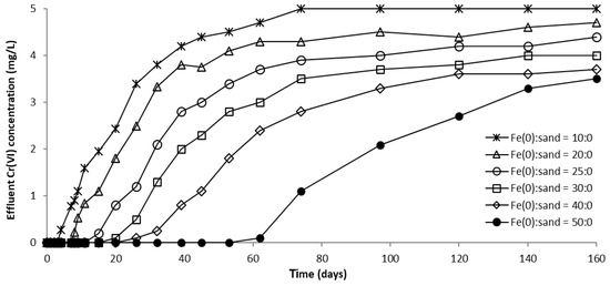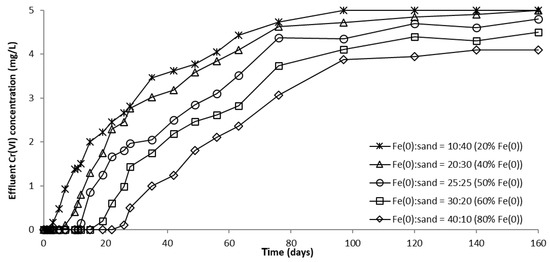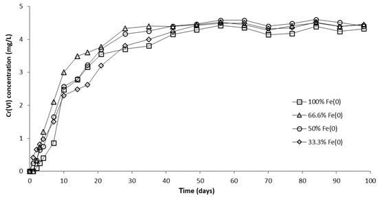 For columns packed with a reactive zone containing 50–100% Fe0, CrVI concentration increased after breakthrough until a steady-state concentration was observed; the higher the volumetric percentage of Fe0 in the reactive zone, the lower the value of steady-state CrVI concentration. Instead, for columns packed with a reactive zone containing 20% and 40% Fe0, CrVI concentration continuously increased after breakthrough until the initial concentration of 5 mg/L was reached, and no steady-state concentration was observed; this behavior is attributable to the low amount of Fe0 in the reactive zone.