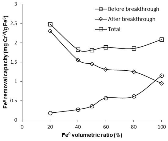 Furthermore, Figure 12, Figure 13 and Figure S16 also reveal that CrVI breakthrough occurred faster for the “Fe0 + sand” system than for the “Fe0 only” control system; the only exception was represented by column experiments with 40 cm3 Fe0, when CrVI breakthrough took place almost simultaneously for the “Fe0 + sand” and the “Fe0 only” systems. This confirms the results obtained in column tests with a reactive zone having fixed Fe0 volume and variable total volume V2 (Figure 8 and Figure 10), supporting the conclusion that the co-presence of sand inside the reactive zone shortens the duration of the period when the column operates with no CrVI detected in the effluent. However, a comparison of the total capacity of the “Fe0 only” and the “Fe0 + sand” system to remove CrVI (Figure 14) reveals that the highest total CrVI removal capacity was observed for the lowest Fe0 volumetric ratio in the reactive zone (i.e., 20% Fe0). Subsequently, by increasing the Fe0 volumetric ratio to 40%, an important decrease in total removal capacity was noted, which was also maintained quasi-constant when the Fe0 volumetric ratio was further increased up to 80%. Finally, an increase in total removal capacity was perceived for the column packed with 100% Fe0; however, total removal capacity of the 100% Fe0 system was lower than the 20% Fe0 system. This corroborates the results obtained in column tests with reactive zone having fixed Fe0 volume and variable total volume V2 (Section 3.3.1), revealing that a water treatment filter with 20–33% Fe0 volumetric ratio in the “Fe0 + sand” reactive zone could be more efficient for removal of CrVI than a 100% Fe0 system.