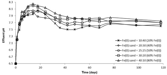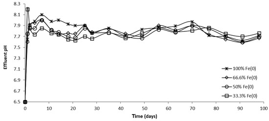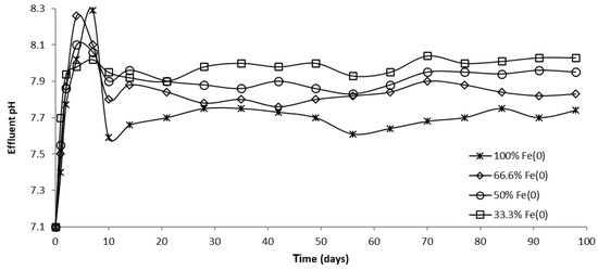 The pH in column effluent vs. time for columns having variable Fe0 volume and fixed total reactive zone volume V2.
